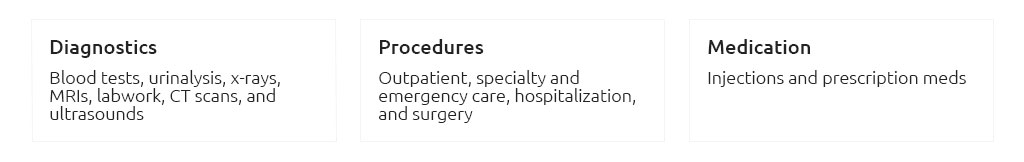- Illness + accident: hospitalization, surgery, imaging (X-ray/ultrasound/CT/MRI), lab work.